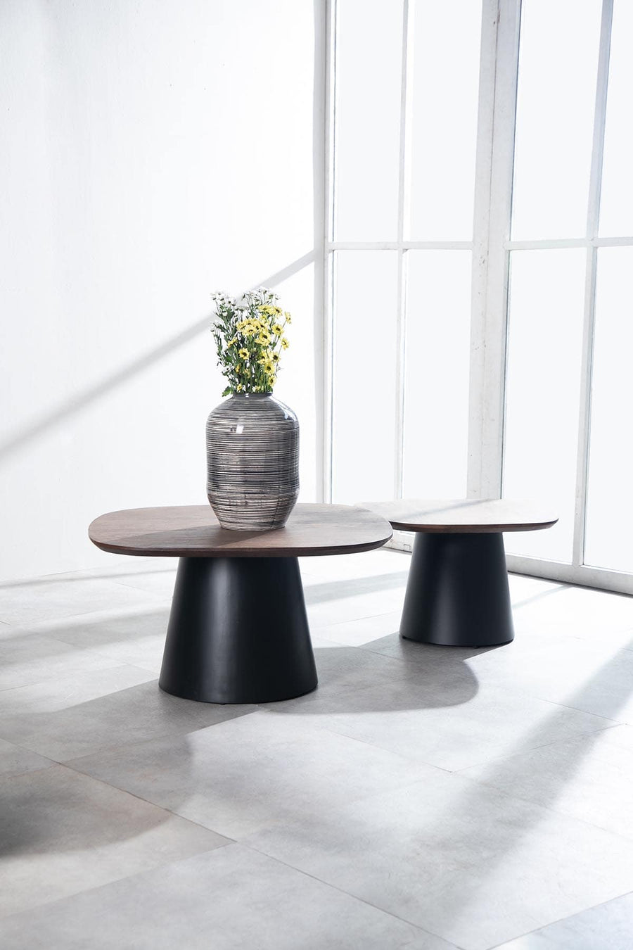 The gently contoured edges of the table top are a singular motif in this set of nested coffee tables. There is a beautiful balancing point between the wooden tops and the splayed-out centrally spun metal legs.
