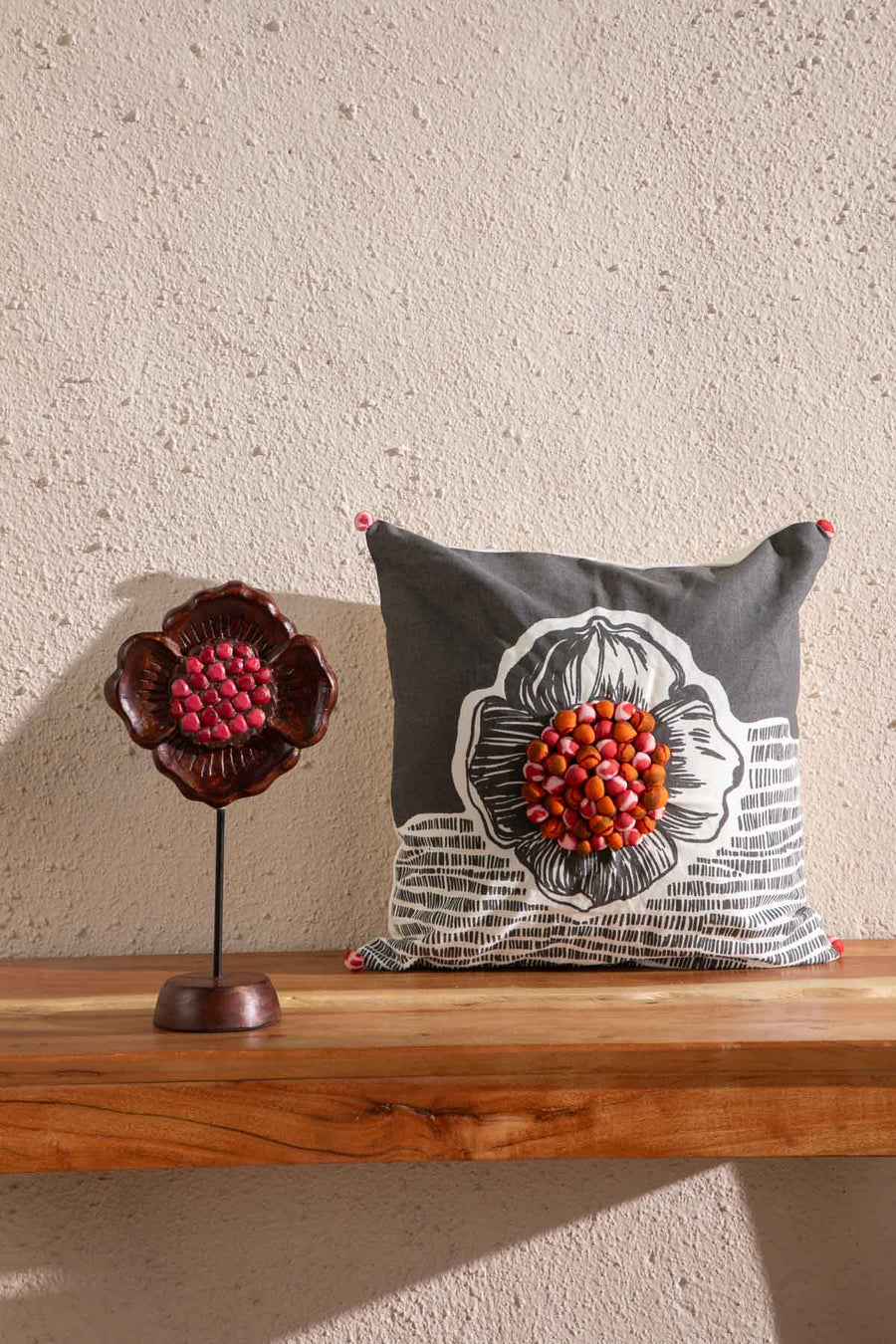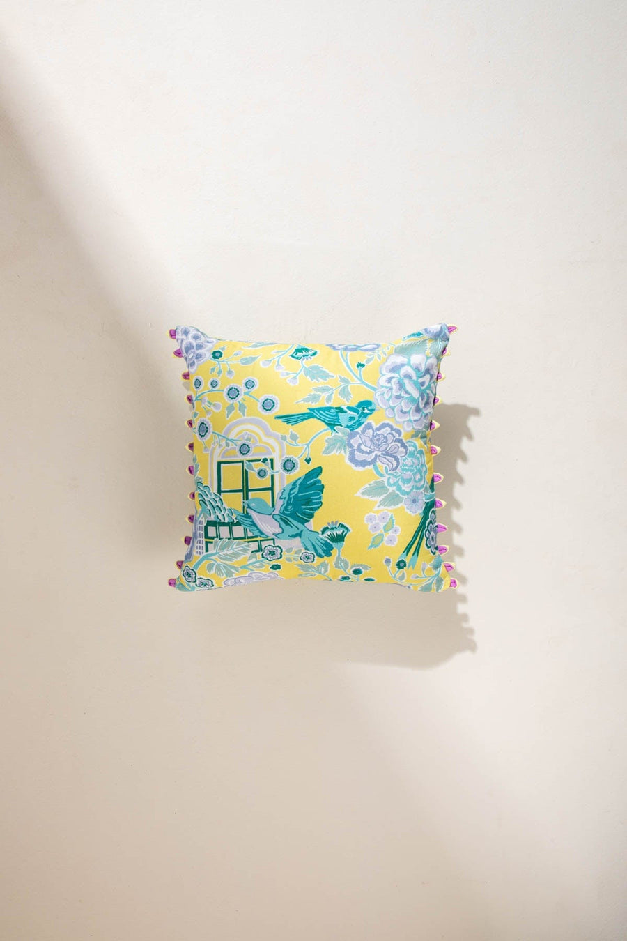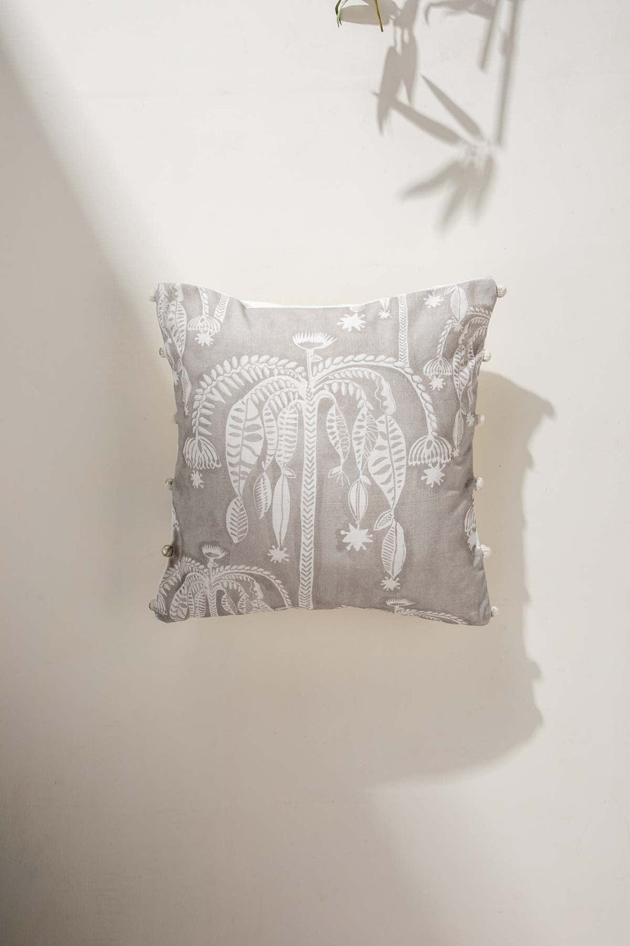 Regular price Rs. 980 An intoxicating scene narrated around the Amapola Tree. A gigantic brush like flower fans out and is a showstopper bloomer on this cushion. Under its shade, creatures find a fine place to cavort.