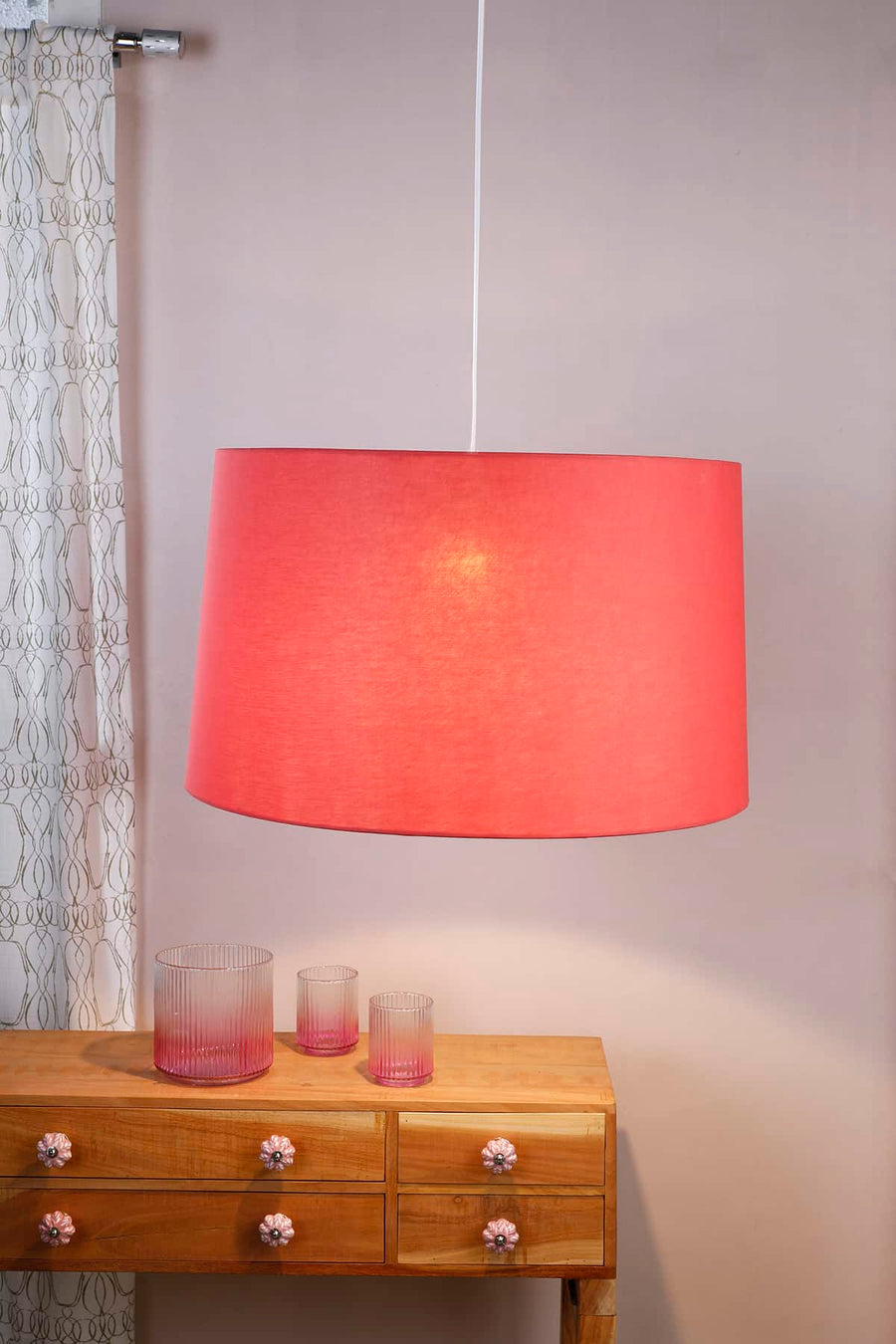 Regular price Rs. 8,980 Sale price Rs. 2,999The criss-cross of white lines on a coral ground in our Grille pendant adds a lively charm to cozy reading nooks and console tables. It doubles as a lampshade, with a versatile design that pairs effortlessly with both natural and metal bases to suit any interior style.