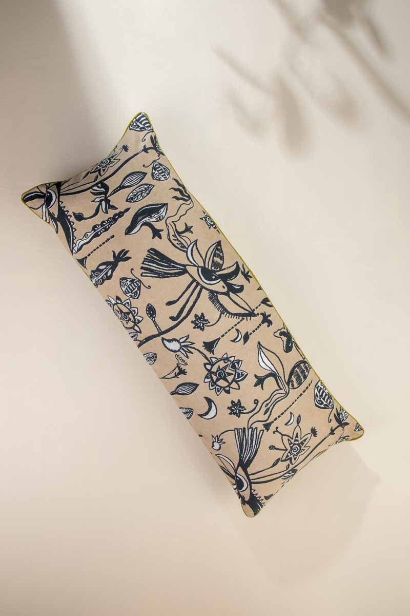 Regular price Rs. 1,480 Sale price Rs. 1,036Eye in the Sky cushion cover flaunts a cheeky scrawl of plant and celestial forms floating in suspended gravity on an attitudinal neutral taupe base. Its appeal lies in its graphic lines. The expanding modern all-over-print, is available in two sizes, and is a good coordinate with our other printed cushions from our Moonflower Collection.