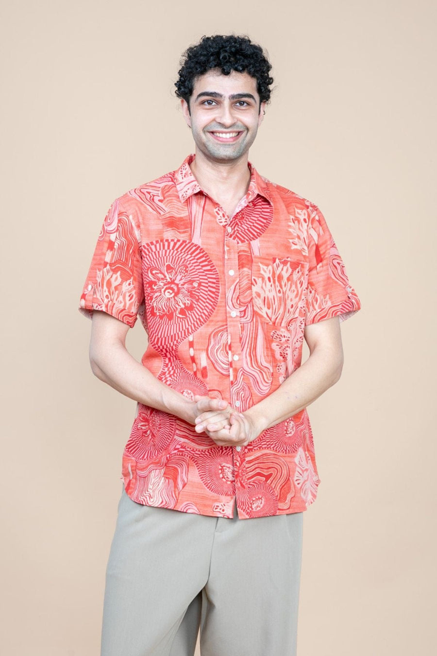 Regular price Rs. 3,600 We can definitely say this, it is our most perfect resort shirt. Tailored collar, sleeves just short to show buff arms, and a gently curved hem delivering relaxed ease with considered structure. The Earth Core print appears abstract at first, gradually revealing intricate fractals of flowers and trees traced with fluid line work that echoes the earth’s shifting strata. A textured ground enhances the richness, adding depth and warmth. In breathable cotton flex, the resort shirt is in a Living Coral hue.