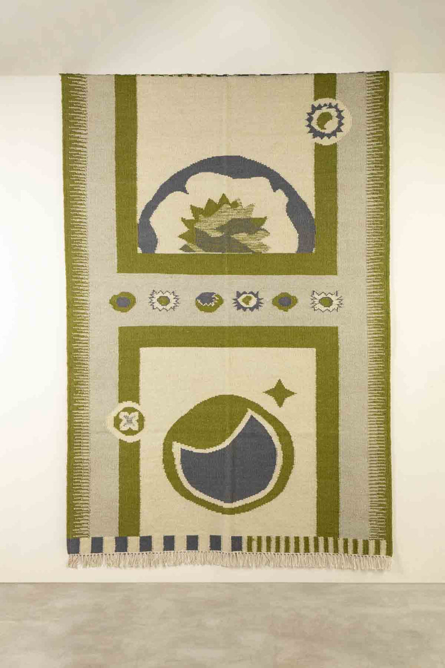Regular price Rs. 4,480The Palmyrah rug give the experince of climbing up stone temple steps. The design is inspired by sacred palm fronds which fall to the ground. Graphically merged with temple steps, it creates a stunning abstract. In soothing sage green on rich cream, it brings the lushness of shade and shadow.