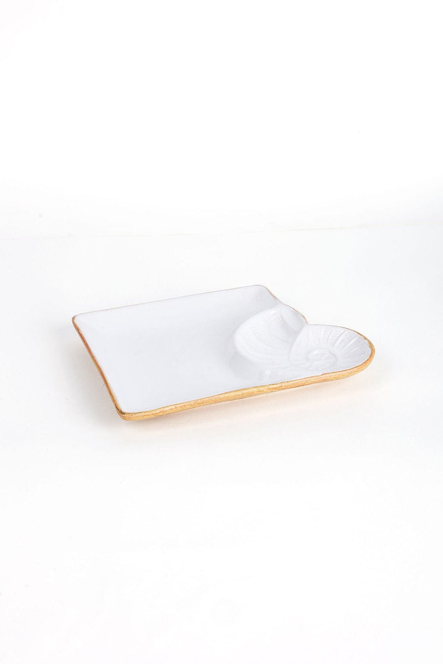 A shell-inspired off-white ceramic platter with a dip section, perfect for serving snacks, crackers, or festive finger foods. Its organic design suits minimal, coastal, or artisanal dining styles.