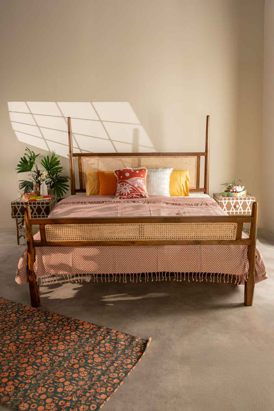 The traditional four poster bed is given an airier update with the introduction of wicker! A melody of materials, panels of handwoven wicker are fitted into teak wood to create a delightful piece worthy of a double take. The carved bed is accented with four tapered legs and treated with a washed, rustic finish that lends decor-friendly warmth. Pair it with your softest bedding and some plush, decorative cushions for a sumptuous sleep.