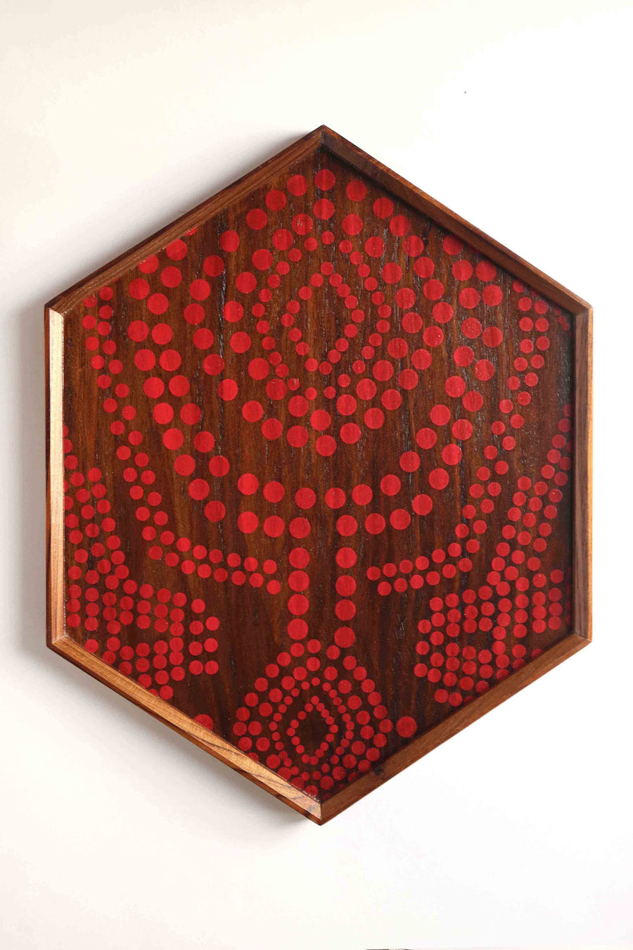 Regular price Rs. 4,200 Sale price Rs. 2,100Meet the Bold Sej Hexagonal Wooden Tray, a hexagonal shape with raised edges. Its design showcases an array of continuous bright red dots. It serves as an accent to your decor and can be used for serving drinks or organizing essentials.