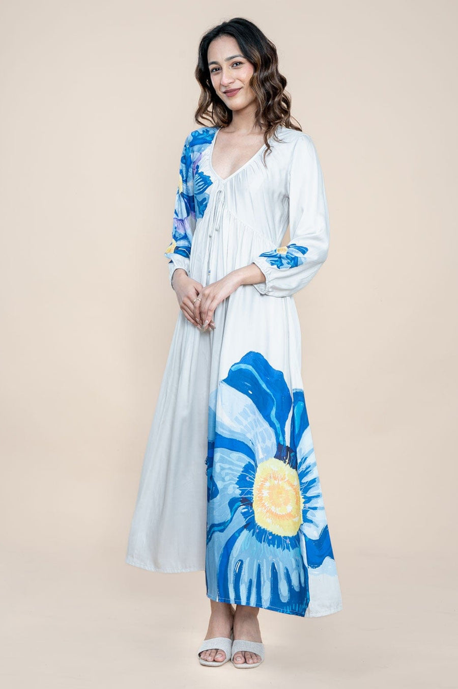 The Empire Line silhouette is sophisticated and sensual. A vixen V-neck gathers under the bust and flows into a romantic ankle-skimming skirt. Crafted in modal satin, this dress pays homage to the rare Himalayan Blue Poppy, known for its stop-and-stare vivid blue petals. Striking floral motifs are meticulously placed and bloom across the hemline and shoulder, drawing attention to this endangered flower found in India’s high-altitude meadows.