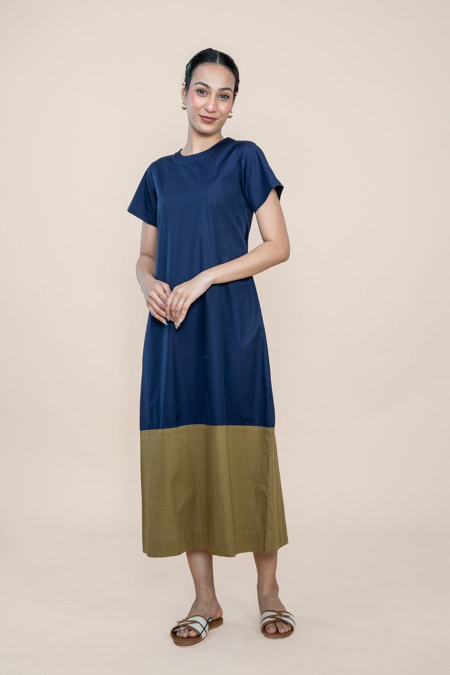 Swinging and stunning, this beauty is love at first sight. Falling in an A-line, the silhouette is slim in the shoulder and generous in the hip. Hidden pockets on the side are a girl’s best-kept secret. Clean short sleeves and a midi length make it a summer special. The deep blue body is grounded by a contrasting olive hem, creating a bold, balanced color story. Tailored in breathable cotton, the solid A-Line Dress blends ease with refined structure.